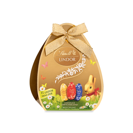Die Lindt LINDOR kleines Geschenk Mischung 67g ist eine kleine Geschenkpackung mit einer Auswahl zartschmelzender LINDOR-Mini-Eier in verschiedenen Schokoladensorten. Die Packung enthält insgesamt 15 Mini-Eier in den Geschmacksrichtungen Vollmilch, Weiß und Feinherb. Im Inneren besitzen die Eier die typische LINDOR-Füllung, die besonders cremig ist und beim Essen weich auf der Zunge schmilzt.